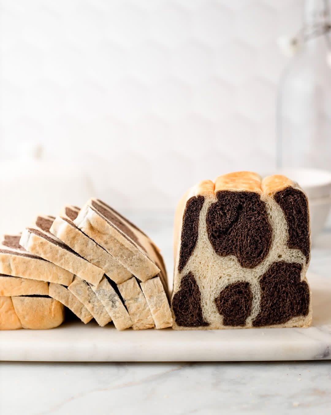 1. The night before, prepare the roux by mixing flour and water. Wrap it in a cling wrap and refrigerate overnight. 2. Next day, with a stand mixer on a dough hook, add in the milk, sugar and yeast and have a quick mix. Then add in the roux, bread flour, salt and unsalted butter. 3. Mix on low speed until all ingredients are combined. Increase the speed to medium and continue kneading until it passes the window pane test. 4. Divide the dough in 2 and place half of the dough back to the mixer, add in 8g of black cocoa powder and mix on low speed until the cocoa powder is well incorporated. 5. Place the 2 doughs in separate bowls, cover with cling wrap and let them rise for about 1 hour or until double in size. 6. Punch the dough to degas and divide the white dough into 4 equal parts; divide the cocoa dough into 4 parts with irregular sizes (to your liking). 7. Roll the cocoa dough into a long strip almost the length of your loaf pan. Flatten the white dough and wrap the cocoa dough. Place it into the loaf pan and repeat with the other dough. 8. Once all dough are in the loaf pan, cover it with a wet tea towel and place it in a warm place and let it rise for about 40 mins. 9. Preheat oven to 365F. Bake the bread for about 30-35 mins. Remove the loaf from the pan and let it cool completely before slicing.View original recipe